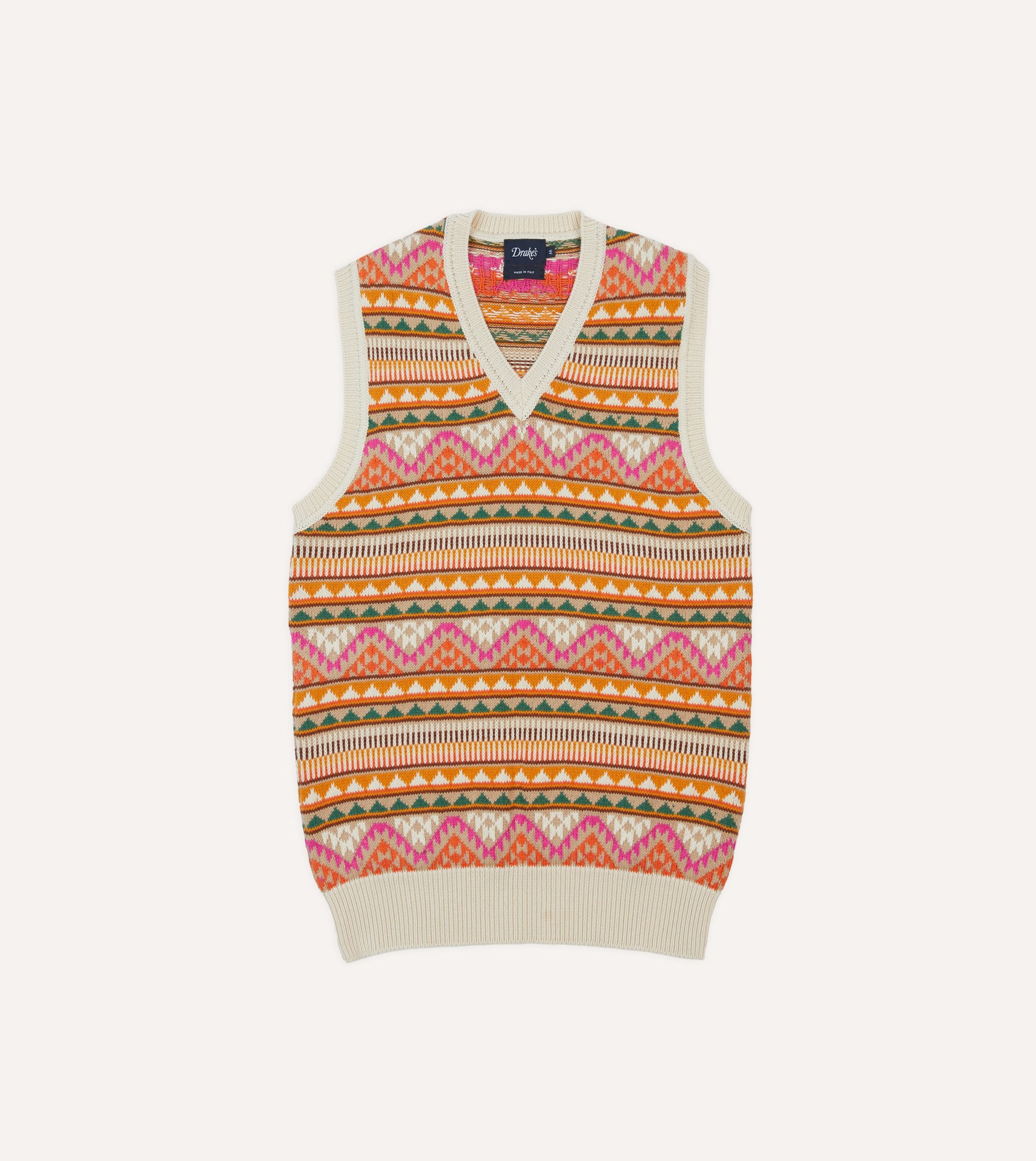 A Summer variation on an enduring piece of classic British knitwear. Woven from a blend of cotton and cashmere. the vest features a Kilim-inspired design.