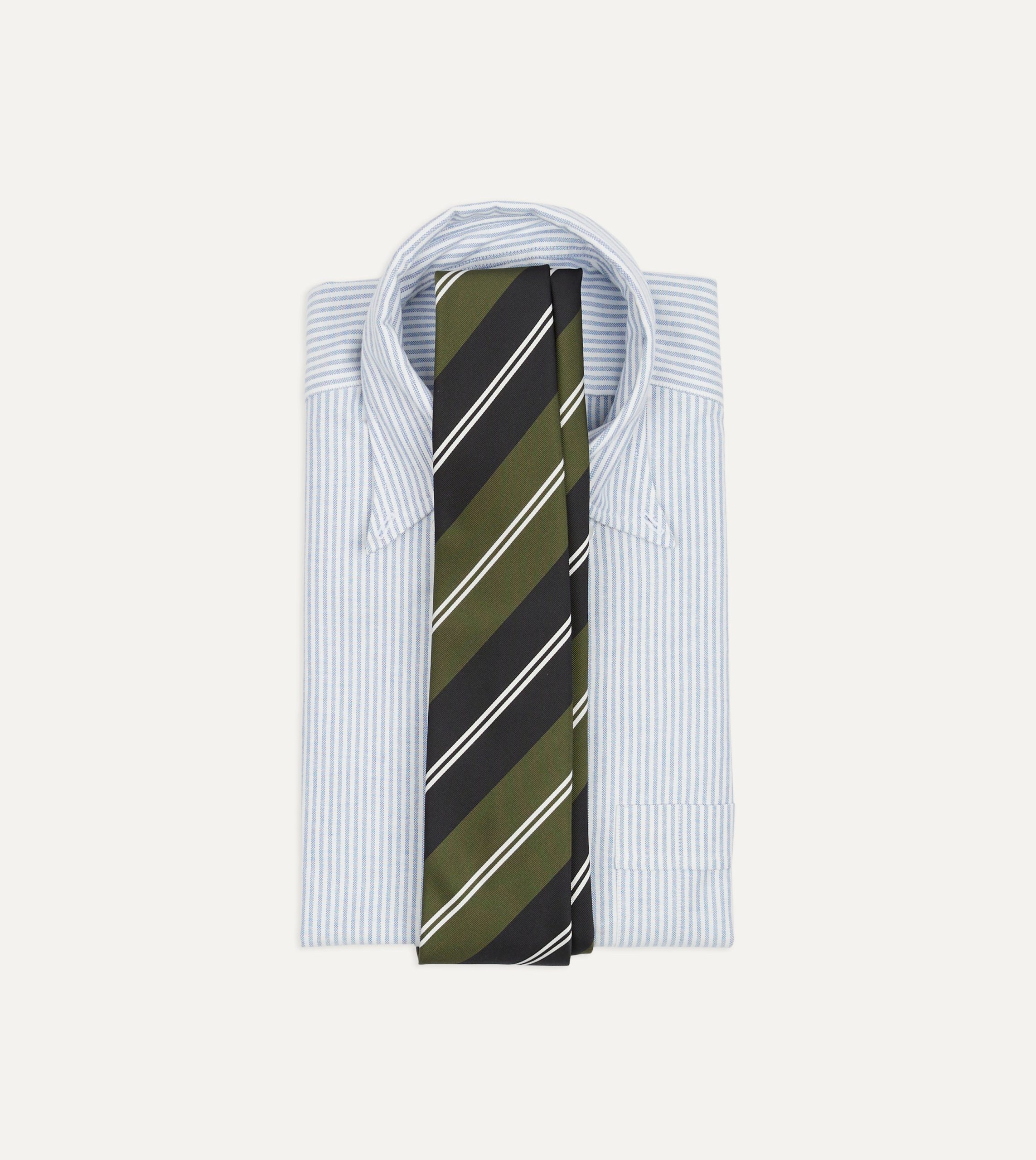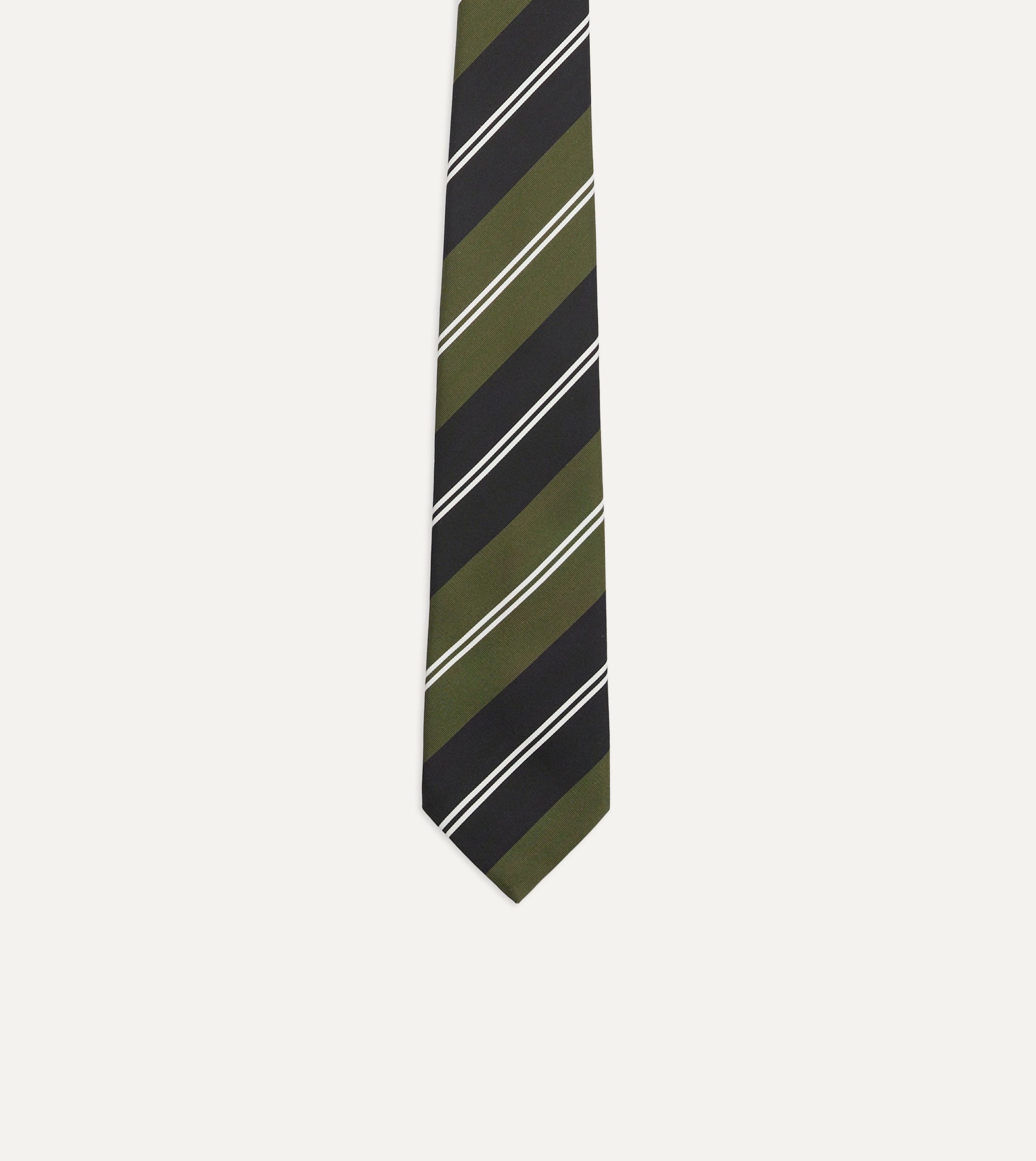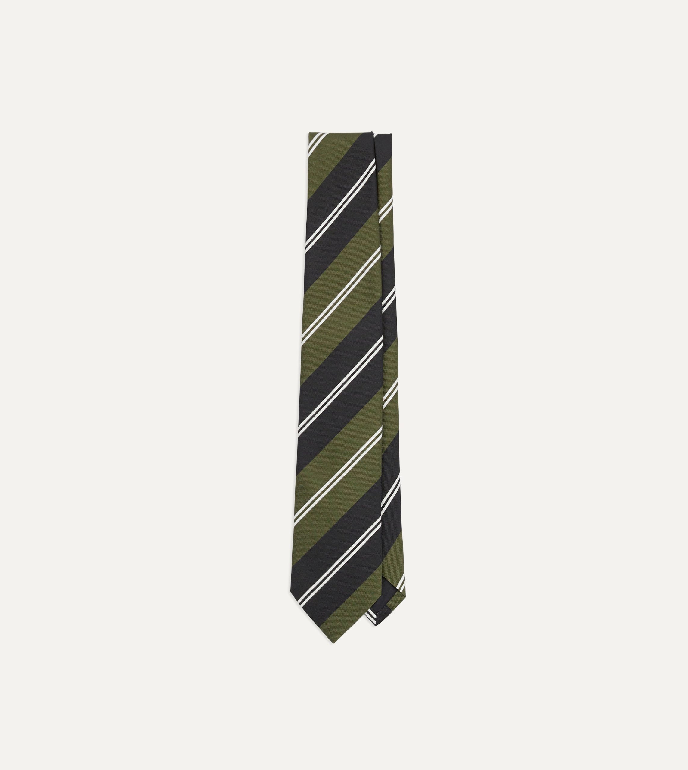 Cut from a beautiful mogador cloth. which blends silk and cotton for a substantial hand and a matte finish. this tie makes an impression with a regimental stripe motif.