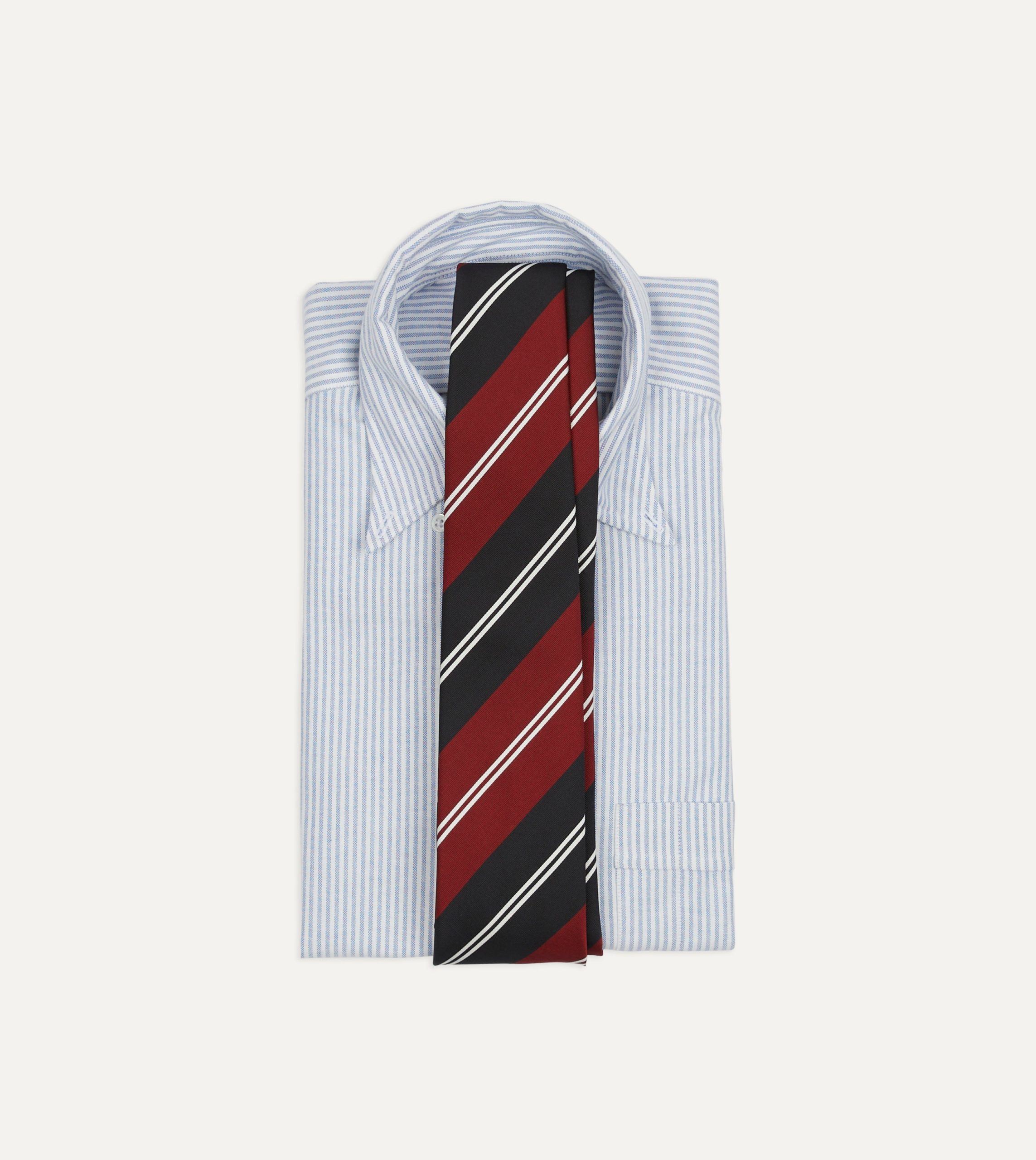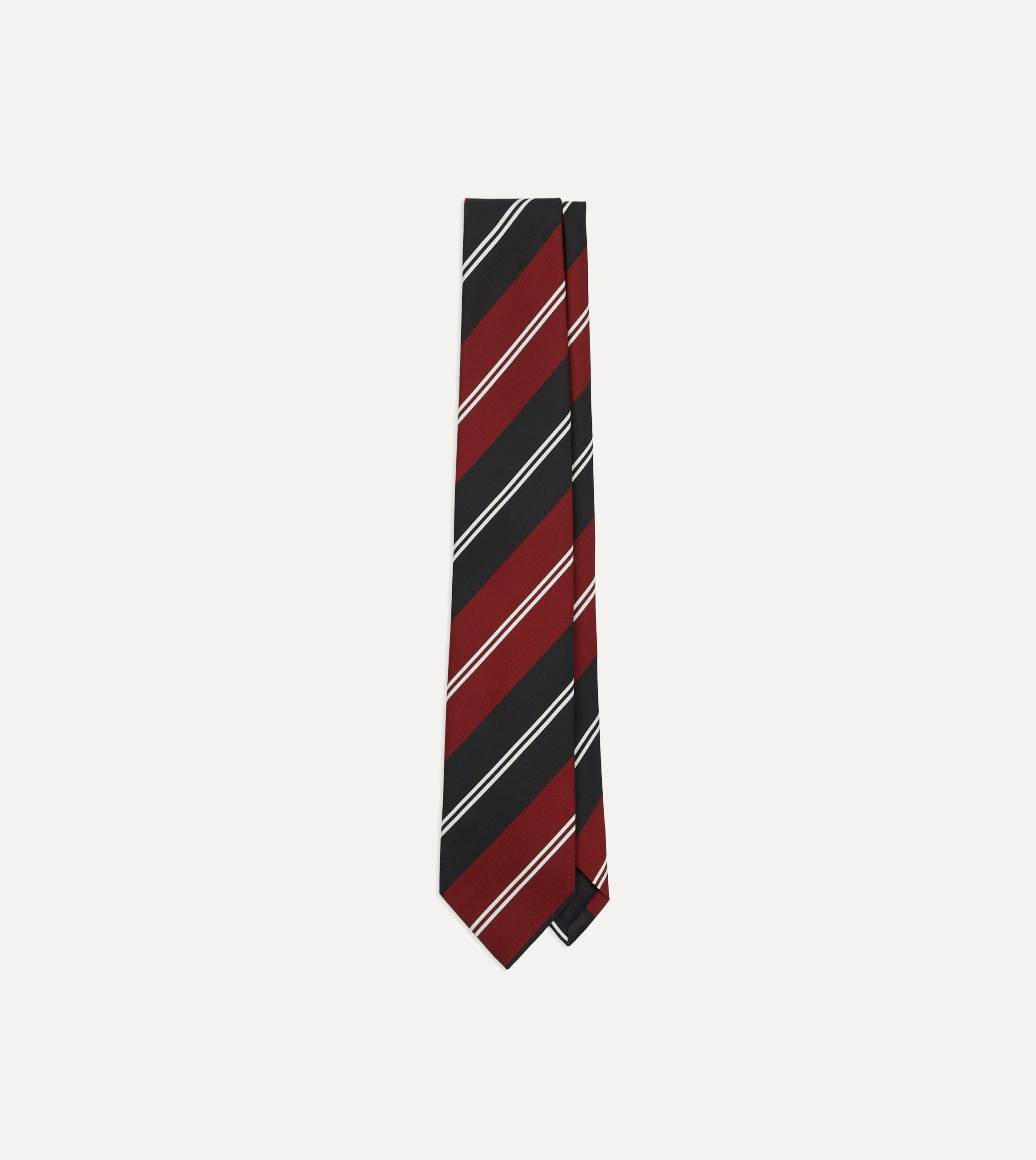Cut from a beautiful mogador cloth. which blends silk and cotton for a substantial hand and a matte finish. this tie makes an impression with a regimental stripe motif.