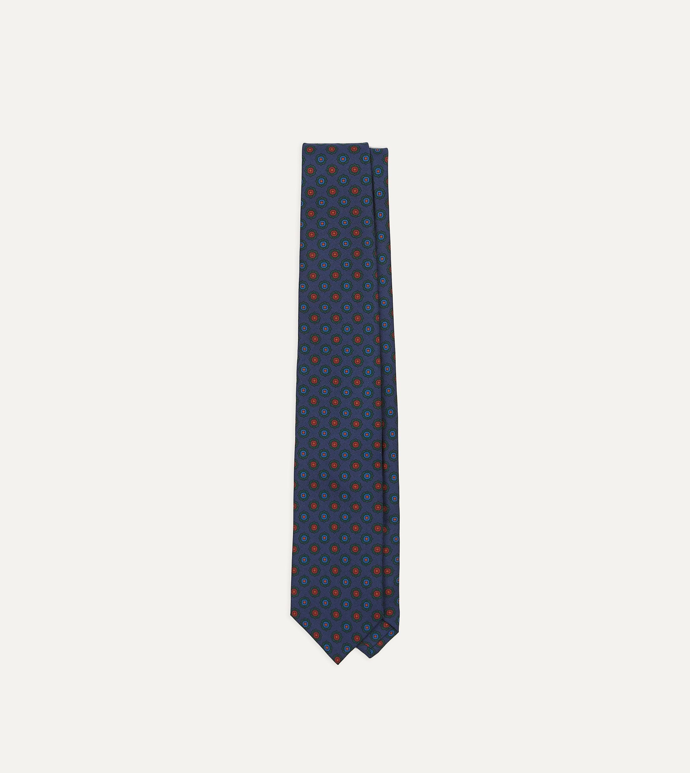 Navy Flower Medallion Print Silk Twill Self Tipped Tie