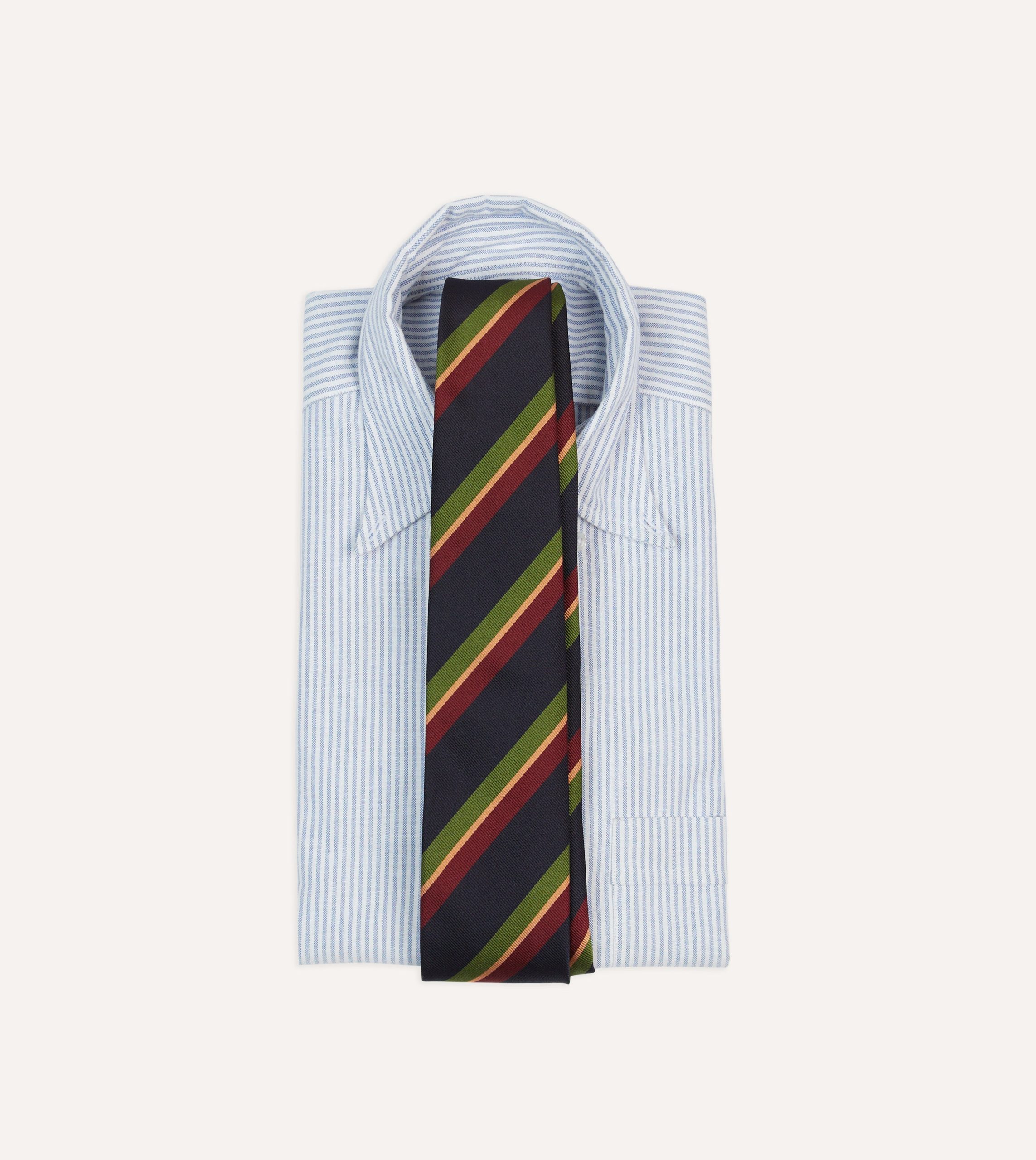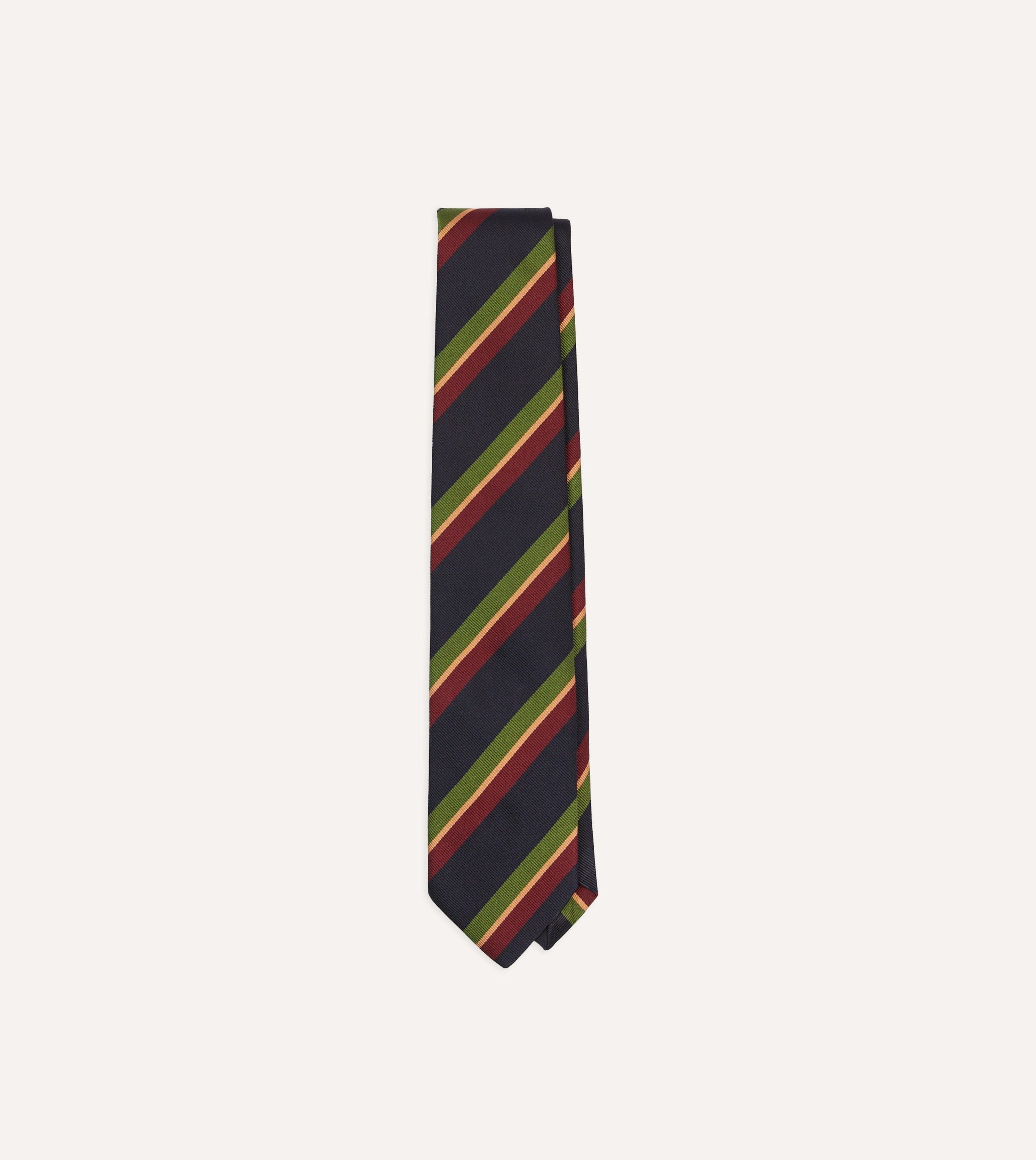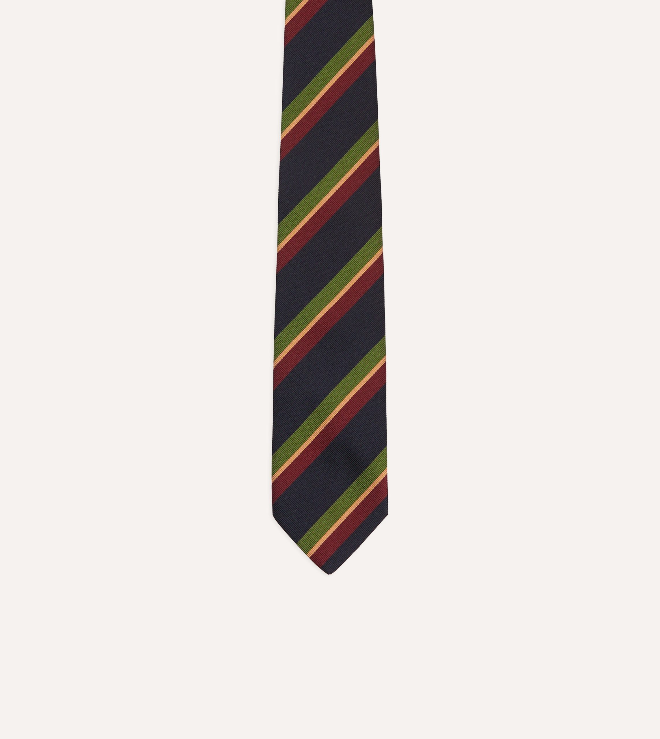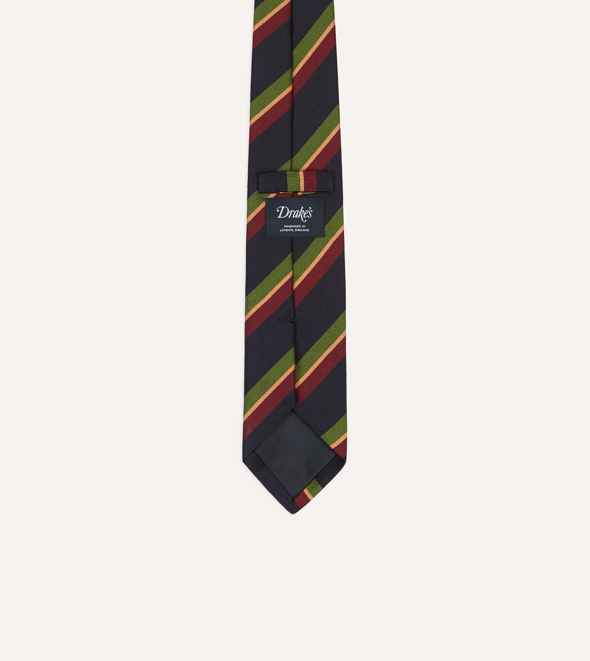 Navy. Green and Red Sandwich Stripe Repp Silk Tipped Tie